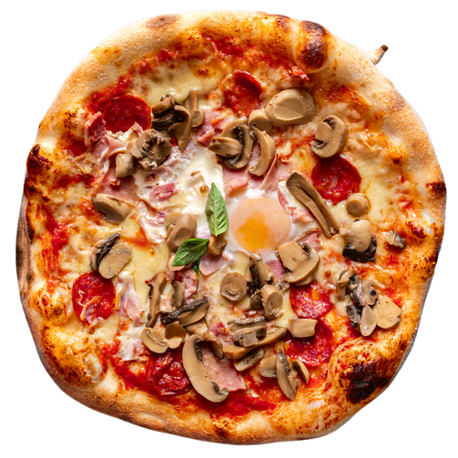 Tomatensauce, Mozzarella, Schinken, Ei, Salami, Pilze