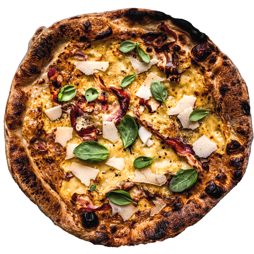 Mozzarella, Speck, Ei, Parmesan, Basilikum