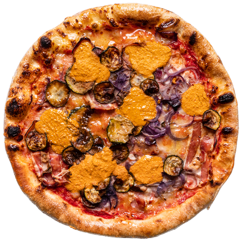 Tomatensauce, Mozzarella, frittierte Zucchini, Speck, Zwiebel, Knoblauch, Tomaten-Basilikum Pesto