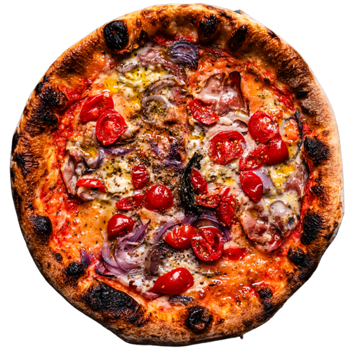 Tomatensauce, Mozzarella, Zwiebel, Speck, Cocktailtomaten, Gorgonzola, Basilikum