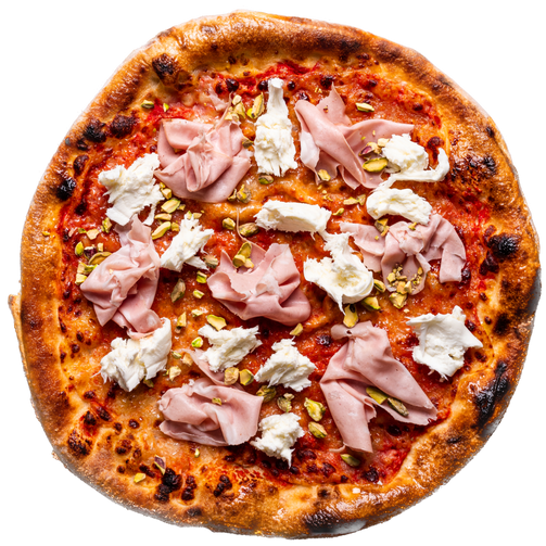 Tomatensauce, Mozzarella, Mortadella, Pistazien, Büffelmozzarella