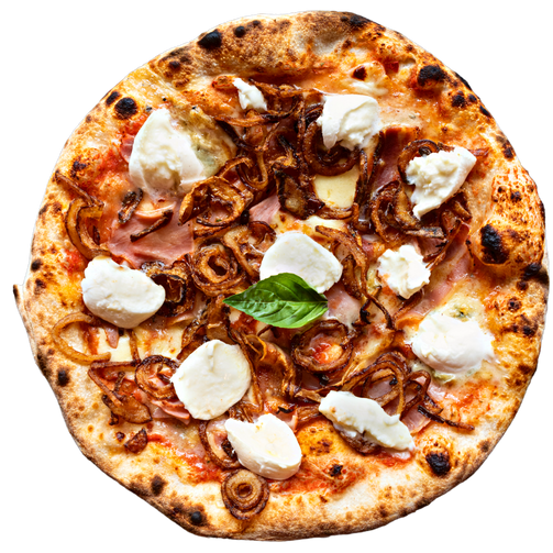 Tomatensauce, Mozzarella, Schinken, Büffel Mozzarella, Bacon, Röst Zwiebel, Gorgonzola