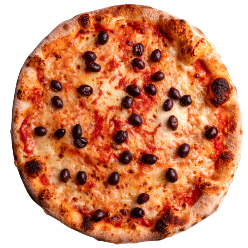 Tomatensauce, Mozzarella, Oliven, Basilikum, Öl