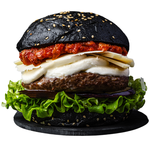 Black bun, Hamburger, Salat, Aubergine, Mozzarella, Parmesan, Tomaten Chutney