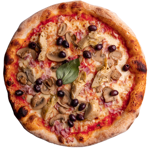 Tomatensauce, Mozzarella, Schinken, Artischocken, Pilze, Oliven, Basilikum, Öl