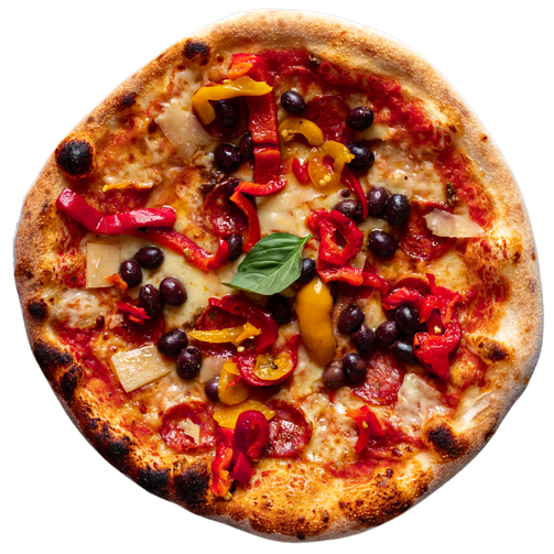 Tomatensauce, Mozzarella, scharfe Salami, Oliven, Paprika, Basilikum, Öl