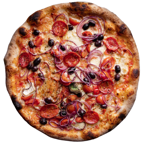 Tomatensauce, Mozzarella, Brie, Cocktailtomaten, scharfe Salami, Oliven, Origano, Zwiebel