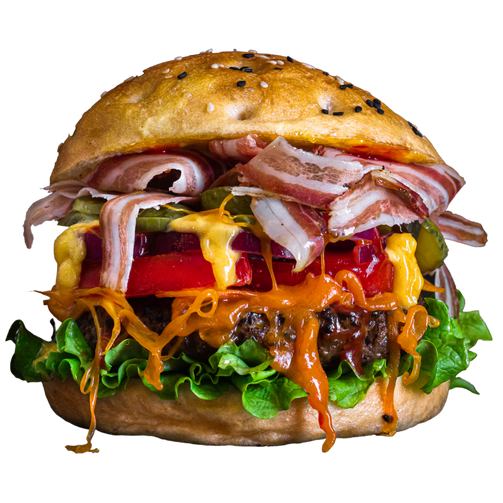 Hamburger, Tomaten, Salat, Zwiebel, Gurken, Cheddar Käse, Bacon, BBQ Sauce, Mayonnaise