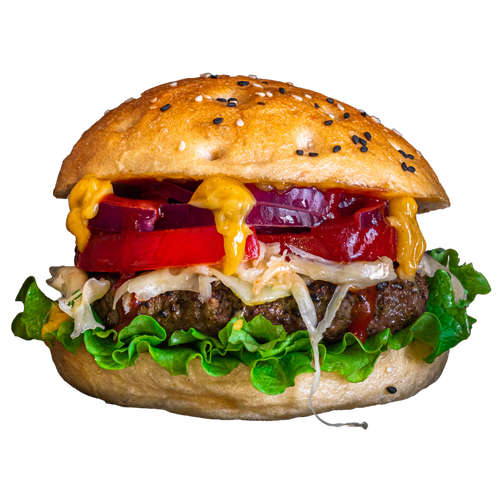 Hamburger, Tomaten, Salat, Zwiebel, Käse, Ketchup, Mayonnaise