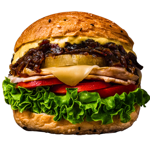 Hühnerbrust, Salat, Ananas, Käse, Karamellisierte Curry Zwiebeln, Sweet Chili Mayo