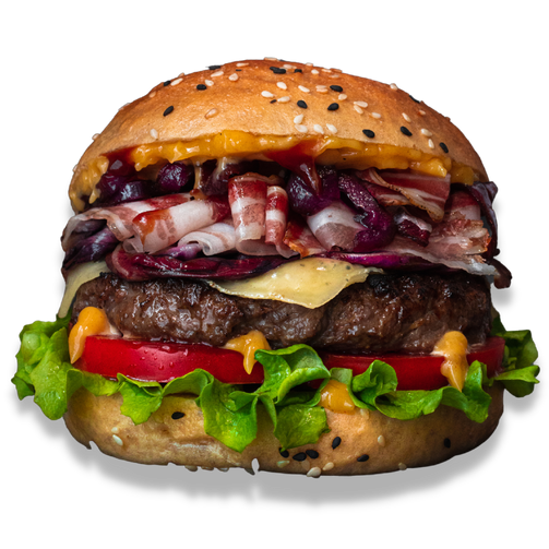 Hamburger, Tomaten, Salat, Radicchio, karamellisierte Balsamico-Zwiebeln, geräucherter Provolonekäse, Bacon, Mayonnaise, Barbecuesauce