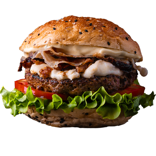 Hamburger, Tomaten, Salat, Gorgonzola, Speck, frittierte Zwiebel, Pfeffersauce