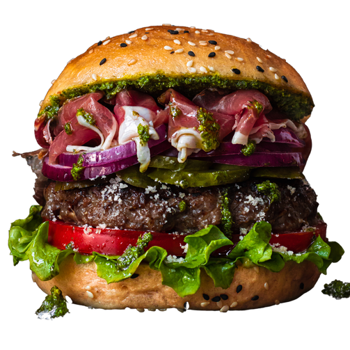 Hamburger, Tomaten, Salat, Zwiebel, Gurken, Rohschinken, Parmesankäse, Pesto, Mayonnaise, Barbecuesauce