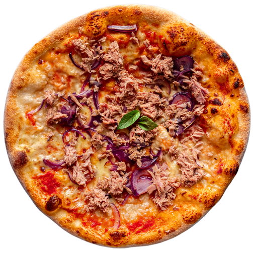 Tomatensauce, Mozzarella, Thunfisch, Zwiebel, Basilikum