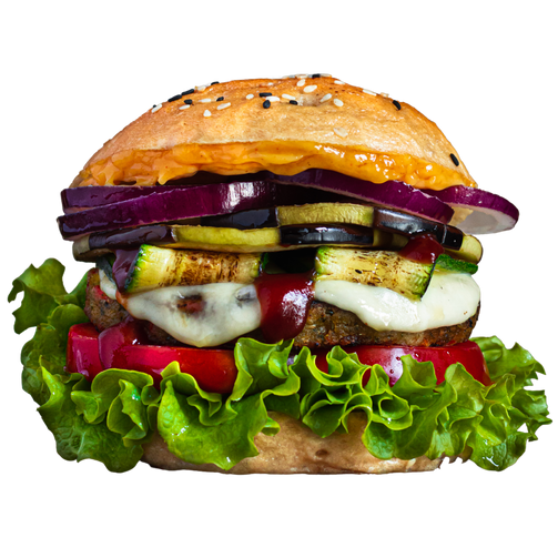 Gemüsepatty, Tomaten, Salat, Zwiebel, Aubergine, Zucchini, Mozzarella, Barbecuesauce, Mayonnaise